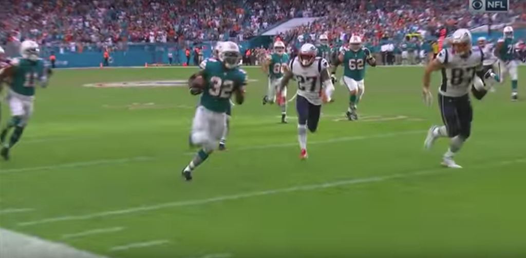 El quarterback Ryan Tanehill recibió el balón y tiró un pase al centro que fue recibido por Kenny Stills, quien a su vez lanzó de manera lateral hacia la derecha para conectar con DeVante Parker cerca del medio campo. Como si fuera un «tochito», Parker hizo otro pase al running back Kenyan Drake, quien de manera increíble esquivó a todos sus rivales y corrió 52 yardas para anotar y ganar el juego 34-33.