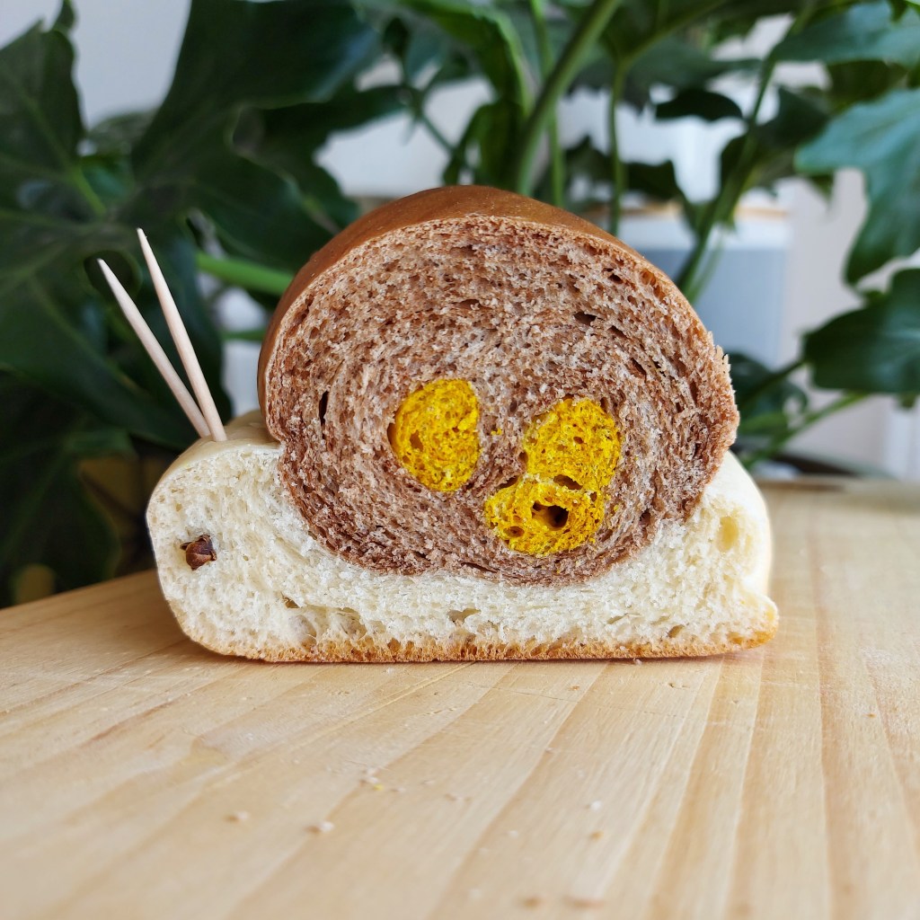 Precisamente esa misma sobrina vino de visita hace unas semanas a casa, la cuidé en lo que su mamá llevaba a la abuela y bisabuela a la tan anhelada vacuna. Como «cayó» de sorpresa, no tenía mucho que ofrecerle a la hora del refrigerio. En las casas donde hay pequeños suele haber mini quesitos, salchichas, juguitos, yo qué sé; en la mía no hay nada de eso. Pero había pan de cúrcuma y qué creen, ¡es amarillo! (que se acerca mucho al naranja).