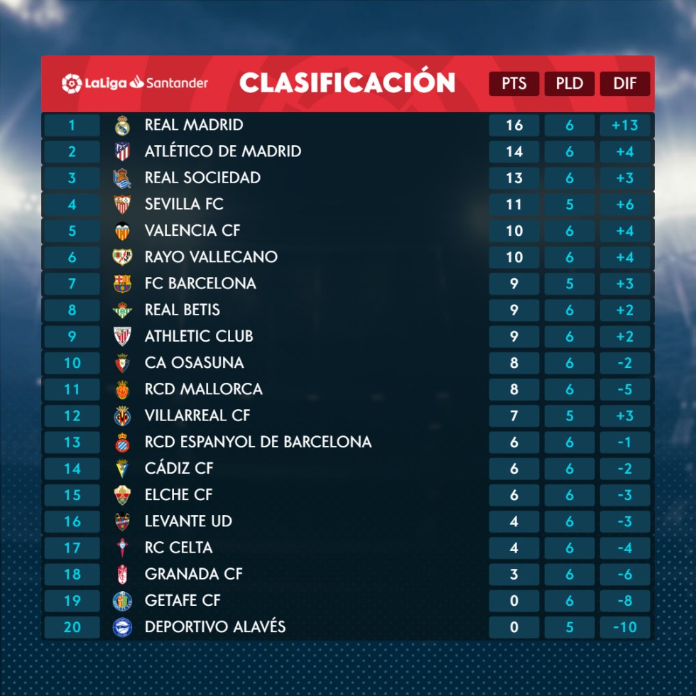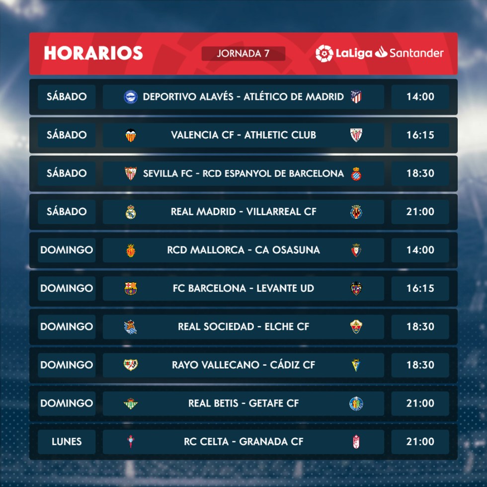 La Liga Santander no descansa tras los partidos de entre semana, ya que la séptima jornada se disputa este sábado, domingo y lunes. Los encuentros están muy equilibrados, incluso a estas alturas de la temporada, entre los que destaca el Real Madrid-Villarreal CF del sábado por la noche.