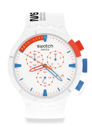 El cronógrafo blanco aparece en una caja de bio-cerámica de 47mm y cristal de bioplástico. El temporizador del cronógrafo no está establecido en el marcador de hora completo habitual, sino 10 segundos antes, y se ha resaltado en rojo como un guiño a la cuenta atrás para el despegue. La corona está situada a las 3 en punto junto a dos botones y las trabillas aparecen en rojo y azul, las agujas con Swatch Glow y el logotipo de la NASA completan el diseño.