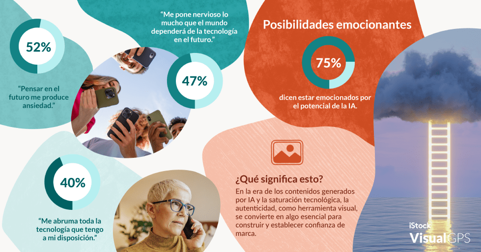 En un mundo dominado por los avances tecnológicos y la incertidumbre sobre el futuro, las preocupaciones de los consumidores han aumentado en el último año. Según el estudio de iStock, el 52% de los encuestados manifiesta ansiedad ante el futuro, y el 47% está nervioso por la creciente dependencia del mundo en la tecnología. Además, el 40% dijo sentirse abrumado por la multitud de tecnologías disponibles. Sin embargo, en medio de estas preocupaciones parece que existe una oportunidad: el 75% de las personas expresó entusiasmo sobre el potencial de la inteligencia artificial (IA).