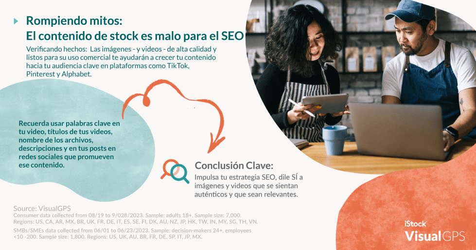 El auge de los videos de TikTok también ha influido en el comportamiento de búsqueda de los consumidores, quienes utilizan esta y otras plataformas para encontrar servicios o productos, lo que convierte al SEO (search engine optimization) de video en una prioridad para las empresas. En respuesta a un mito común en relación con buenas prácticas de SEO, los expertos de iStock subrayan que las imágenes -y videos- de stock no tienen un efecto perjudicial en el SEO. De hecho, las imágenes y videos de alta calidad, incluyendo la fotografía comercial, pueden contribuir significativamente al crecimiento de tu contenido online, especialmente en plataformas como TikTok, Pinterest y Alphabet. Para optimizar el SEO de tus videos, es importante utilizar palabras clave en los títulos, descripciones y en las publicaciones en redes sociales que incluyan videos.