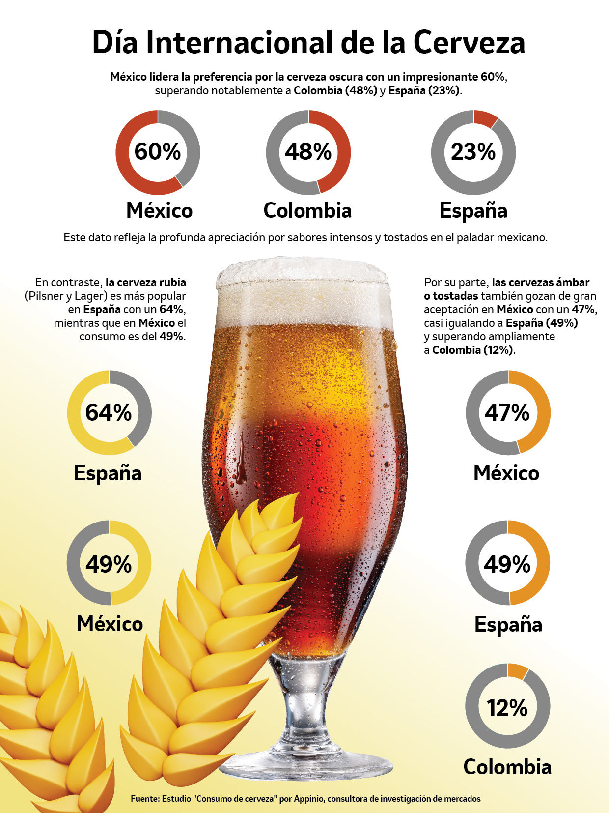 En México, la lealtad hacia las marcas de cerveza nacionales es palpable, con Corona a la cabeza es consumida por el 73% de la población, seguida por Modelo Especial (61%), Victoria (59%) y Tecate (54%). En el caso de España, Estrella Galicia lidera con un 64%, le sigue Mahou (56%) y Alhambra (39%). En Colombia la preferencia por las marcas locales también es fuerte con Club Colombia liderando con un 67%, Águila (63%) y Poker (57%).