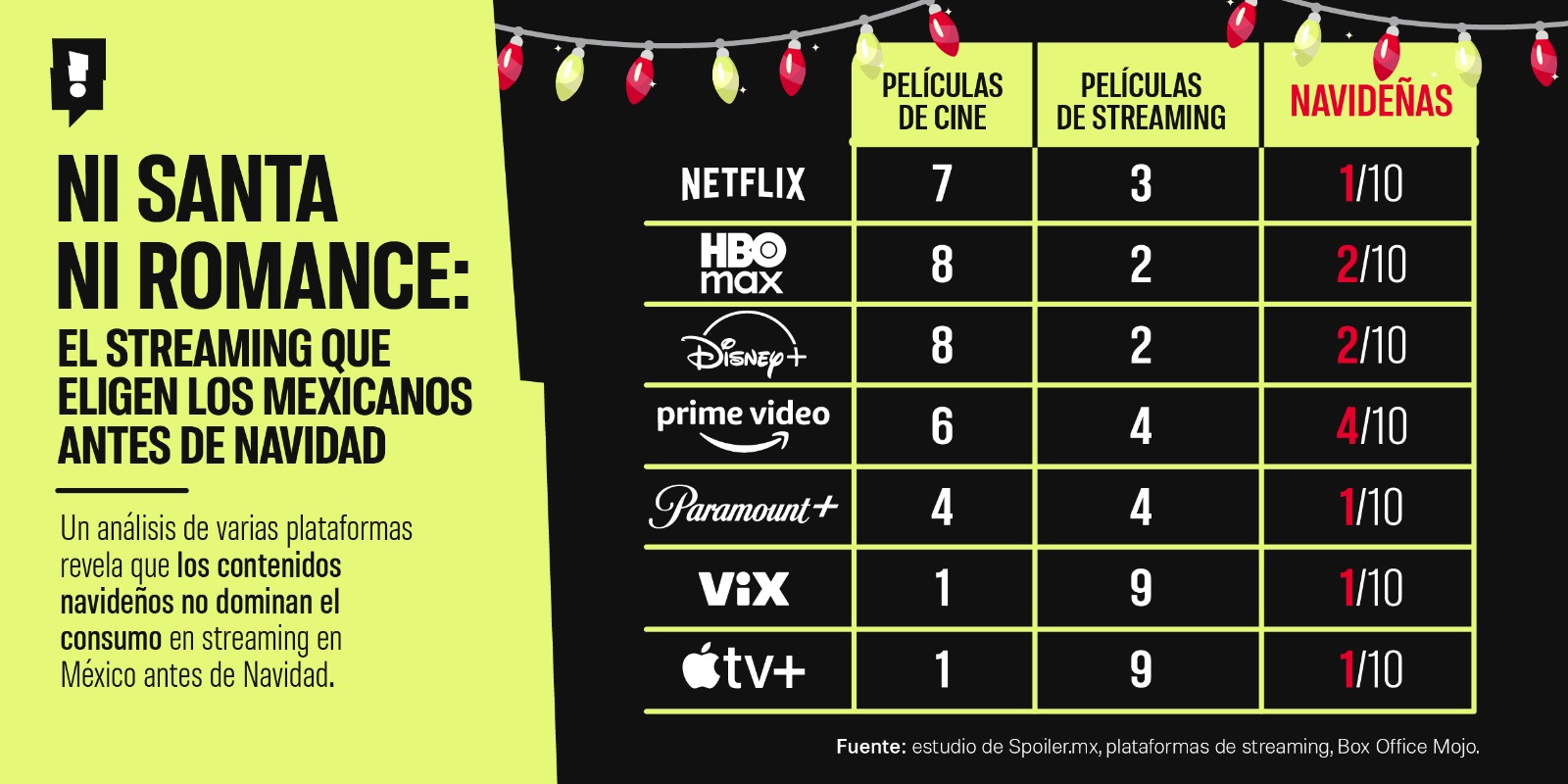 Finalmente, de acuerdo al análisis de Spoiler, Apple TV+ destaca por su apuesta en producciones originales de aventura y cine familiar, con apenas un clásico navideño (La Navidad de Charlie Brown) resistiendo en su Top 10 frente a una avalancha de títulos exclusivos de la plataforma, como Plan Familia 1 y 2 y La Fuente de la Juventud.